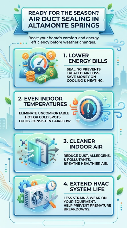 Air duct sealing closes the leaks in your home's duct system that allow conditioned air to escape before it reaches your rooms. In Altamonte Springs, most homes lose 20–30% of cooled or heated air through gaps, disconnected joints, and deteriorated connections — a problem that compounds fast in a climate where HVAC runs nearly year-round.